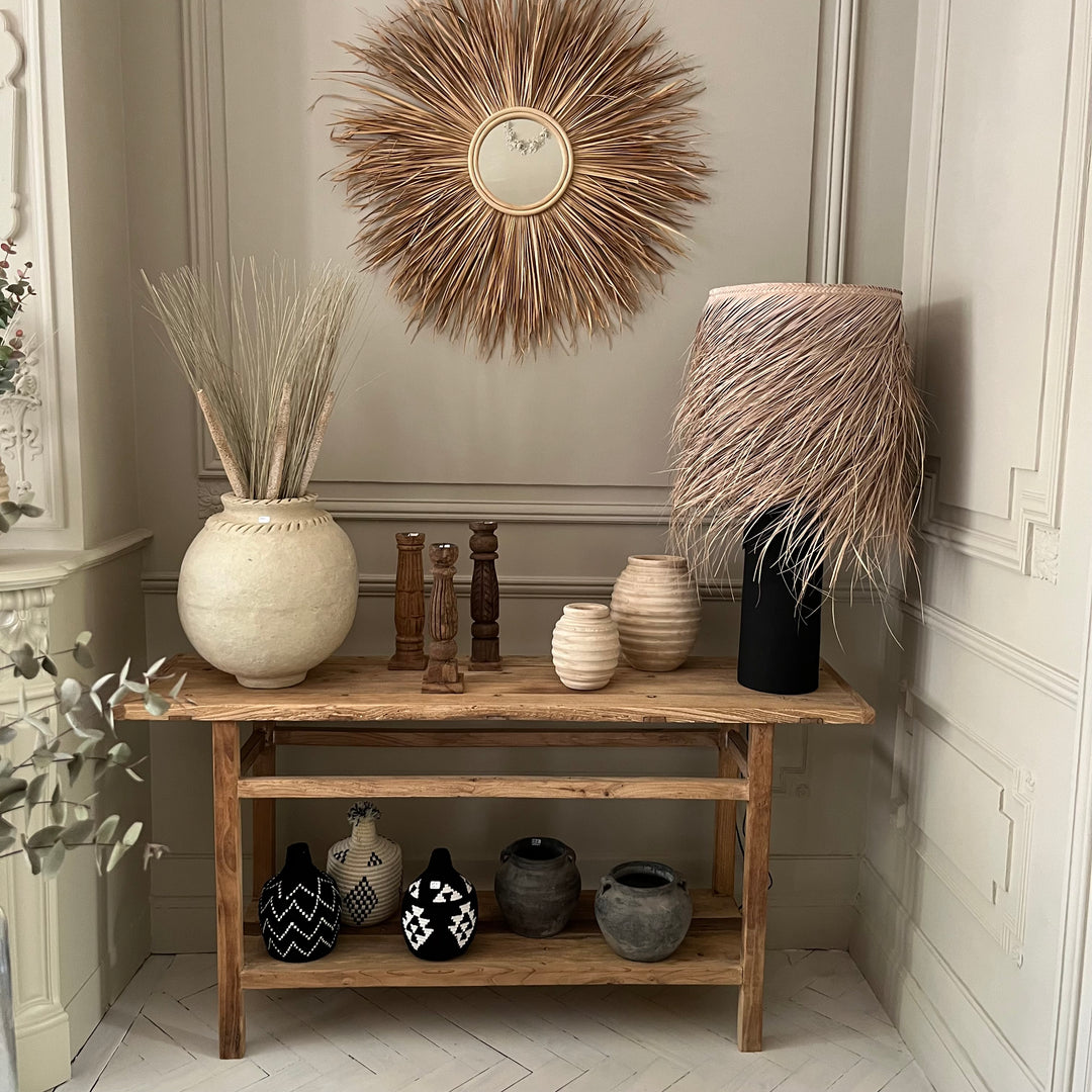 Le mobilier rustique, comme les tables basses en bois brut et les étagères en fer forgé, se marie parfaitement avec les plantes sèches. Ces éléments ajoutent une touche de charme rustique à votre salon bohème.