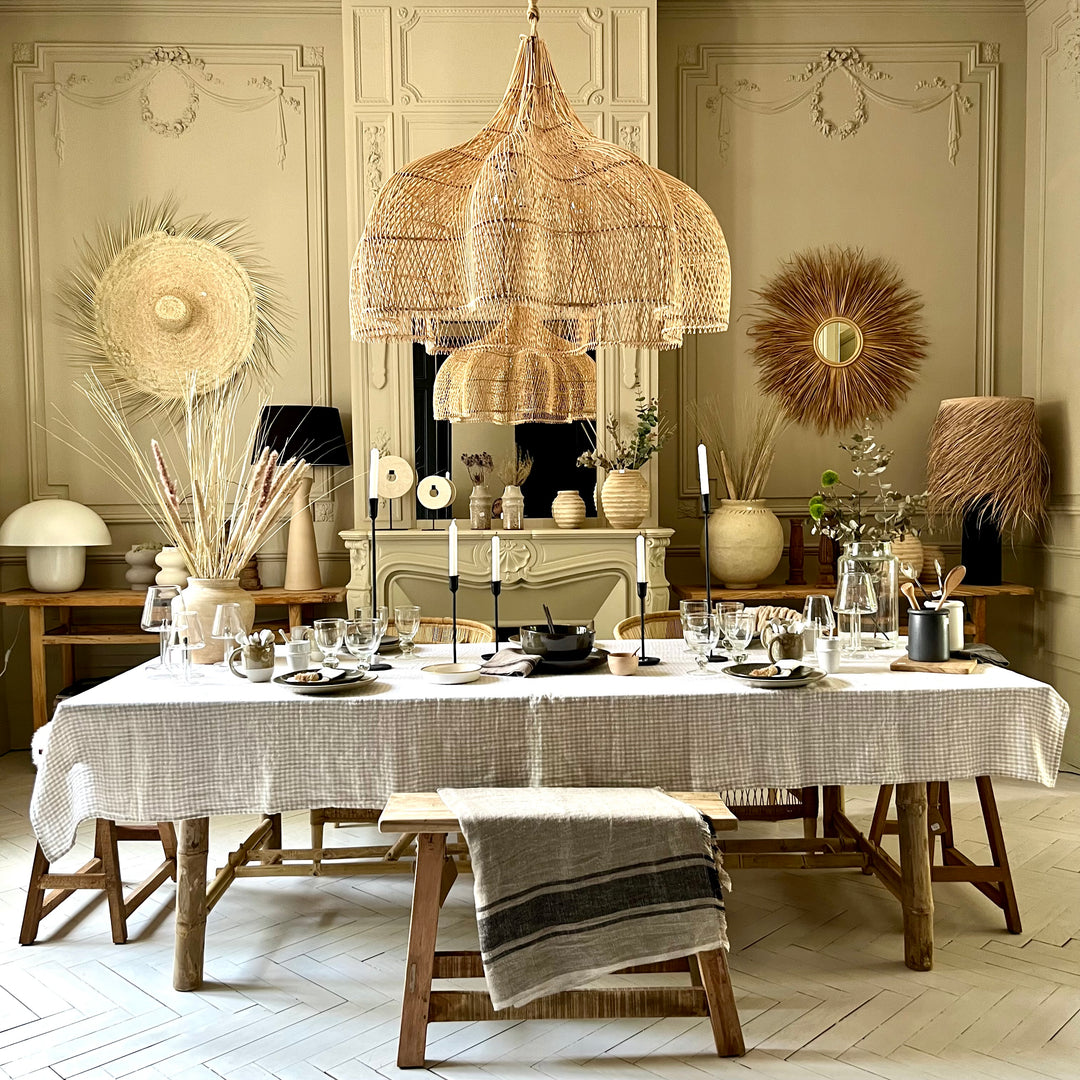La décoration bohème est un mélange éclectique d'éléments authentiques, d'artisanat, de fibres naturelles et de motifs ethniques, le tout dans des couleurs apaisantes et en privilégiant les matériaux recyclés ou anciens. Les plantes sont présentes, mais plutôt sous forme de fleurs séchées et de branchages, avec des pots anciens pour renforcer le caractère bohème.
